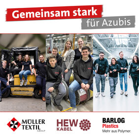 Nach der erfolgreichen ersten Runde des Auszubildenden-Tausch im Rahmen der Ausbildungskooperation zwischen der MÜLLER TEXTIL GROUP aus Wiehl, BARLOG Plastics aus Overath und der HEW-KABEL aus Wipperfürth, wird allseits ein äußerst positives Resümee gezogen. Der nächste Austausch im kaufmännischen Ausbildungsbereich ist bereits geplant.